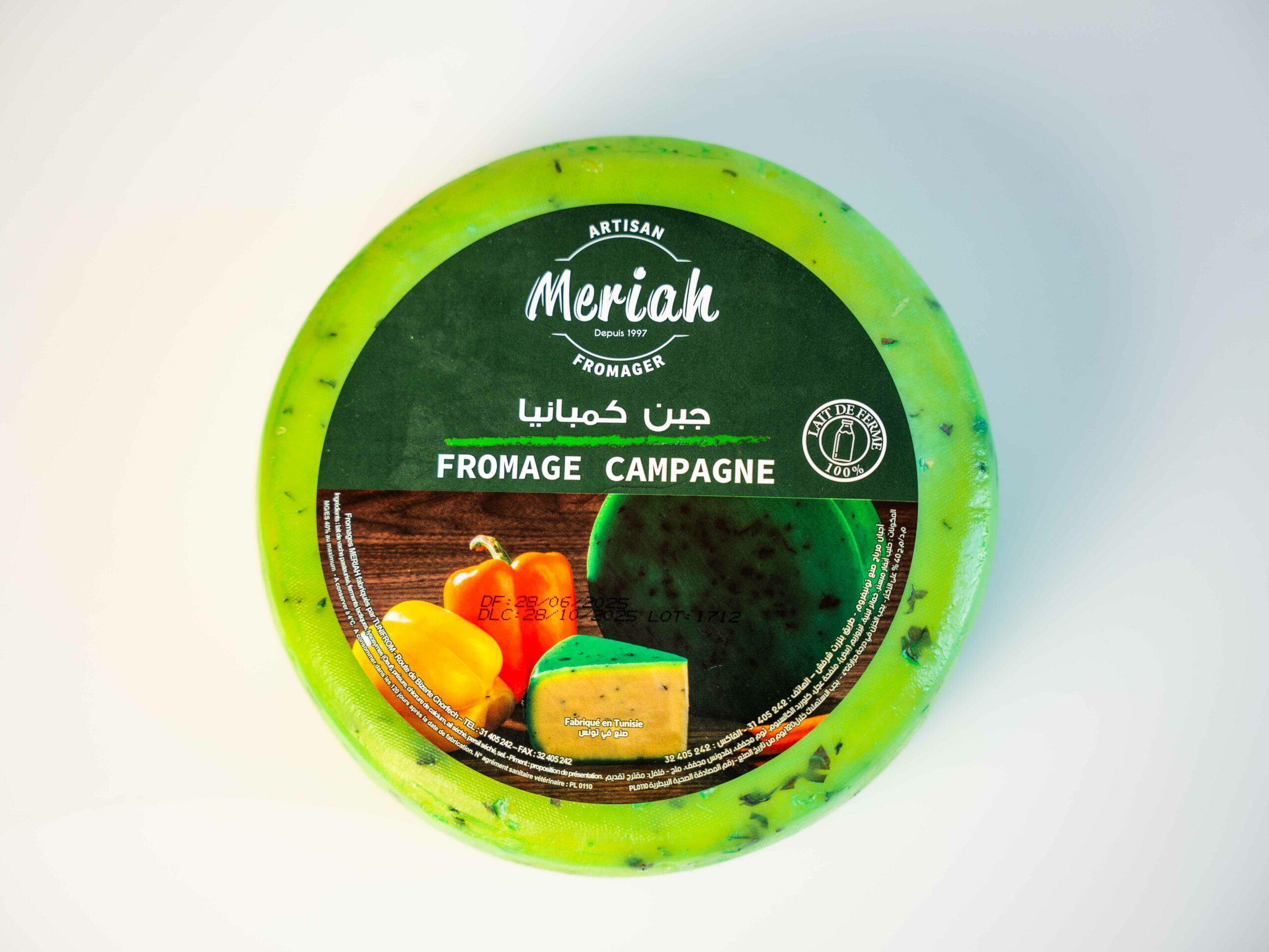 Le Fromage Compagne Meriah est un fromage pressé rustique à la croûte verte distinctive. Goût typé et caractère affirmé. Parfait pour les plateaux et les dégustations. Poids : environ 2 kg. DLC : 120 jours.