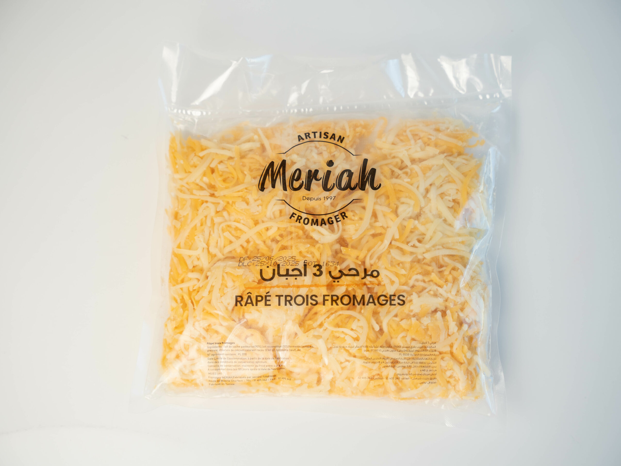 Mélange râpé de 3 fromages Meriah — 1 kg — DLC : 120 jours.